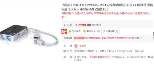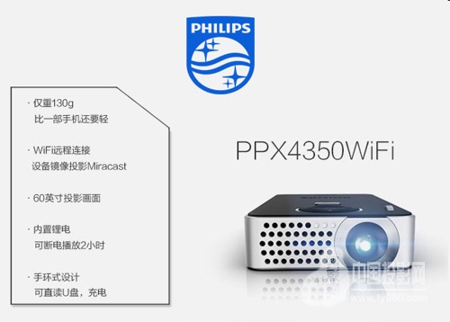 飞利浦PPX4350wifi手持手机微型投影机拥有超便携机身,内置4G内存可MP4播放器,可通过USB,HDMI接口直接连接智能手机安卓手机Iphone6 5 5S都兼容,可随时分享手机内的图片视频文件等 。目前,该机在京东网的销售价格为2199元,感兴趣的朋友可以多多关注一下。
