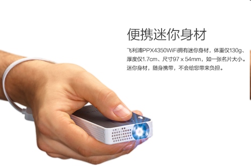 飞利浦PPX4350wifi投影机可连接智能手机,分享手机内的图片等文件。超轻薄机身可直接拿在手里,使用非常方便。随机自带内置3.7V/1800mAH锂聚合电池,即使在无电源的情况下依然能进行投影。