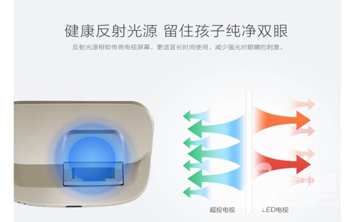 据中、美、澳三国防治儿童近视研究项目报道,我国近视人口数量已居世界前列,且40%以上均为3-18岁的孩子。究其原因,传统液晶电视中的蓝光光源是一大元凶,因为孩子的视力系统尚未发育完全,大约有70%的蓝光都直达视网膜,对视力造成不可恢复的伤害。而一旦发生近视,不仅会降低孩子的课堂学习效率,也会减少报考专业、择业时的可选余地。明基超投电视i920采用了更加健康的反射光源,配合理光高素质内反射镜头,通过将光线投射到屏幕上再反射入人眼的方式,可避免光源直射损害人眼的视力,同时提升30%画面边角均匀性,提供更为安全、清晰、舒适的观赏体验,适合长时间观看时使用。