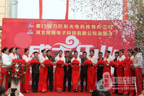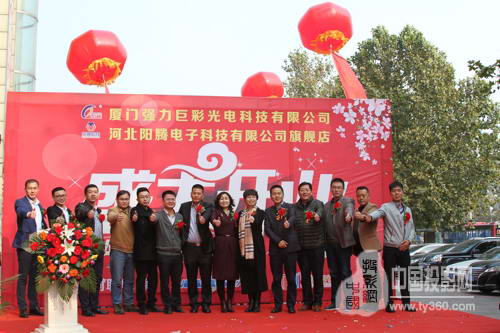 秋末冬初,寒风呼啸,可强力巨彩河北阳腾旗舰店的门口却锣鼓喧天,宾朋齐聚,热烈庆祝盛大开业。厦门强力巨彩光电科技有限公司副董事长周国华,石家庄市新华商业广场总经理王石良,厦门强力巨彩光电科技有限公司副总经理兼营销总监黄志勇、产品代言人廖小斌,上海灵信视觉技术股份有限公司营销总监郑君矗,西安诺瓦电子科技有限公司营销副总监李志敏,常州市创联电源科技有限有限公司销售部经理吴明江等各届社会人士悉数到场祝贺,为阳腾旗舰店开业剪彩。