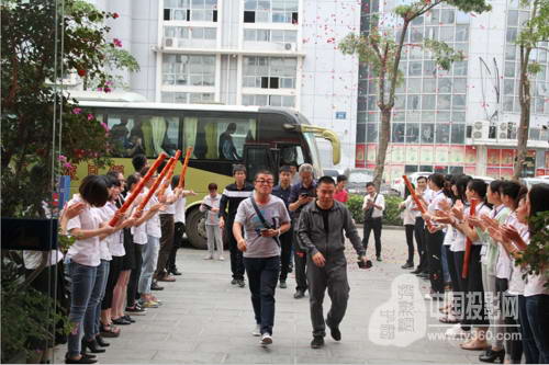 风和日丽的早上,强力巨彩门口礼花与掌声交织,总部工作人员热情欢迎千店服务商们回家。