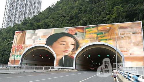 全中国乃至亚洲都独一无二的LED显示屏隧道,即位于贵州省贵阳市南明区的花果园隧道。花果园项目是宏立城集团应党委、政府号召,启动了总投资300亿元、总建筑面积560万m2的花果园彭家湾改造项目。这个隧道位于花果园中,隧道入口处建有一块巨大的LED显示屏,据悉,这块显示屏总面积达475平方米,由深圳市德彩光电有限公司承制。整块屏幕呈M形,屏体与隧道和山体完美的融合在一起。