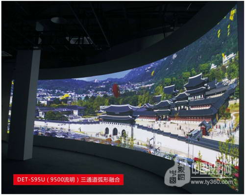 激光工程投影机 DET-S95U×3(亮度9500流明、对比度20000:1、分辨率1920×1200)+标准短焦镜头DET-L2SD 1.14-1.347:1+融合主机=弧形幕(弧形壁)。