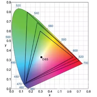 在电影放映的各种指标中,色域和亮度是最重要的两个指标。如下图光谱所示,整个彩色区域是人眼可以看到的所有颜色,从小到大的三个三角形区域是业内不同级别的色域标准,分别为Rec.709,DCI P3和Rec.2020。越高级的色彩标准所涵盖的颜色越丰富,尤其体现在绿色和红色两种人眼最为敏感的两个颜色上。