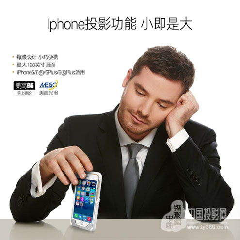 美高G6苹果iphone6手机专用微型投影机的奇妙创意,把苹果手机与投影机在外形、功能实现完美结合,把苹果手机带入100吋大屏时代,扩展了苹果手机的应用范围。