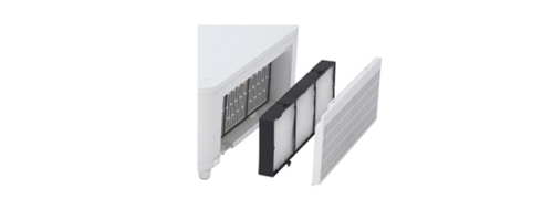 稳定耐用是专业投影产品的重要指标之一,日立F系列的防尘系统采用双重过滤设计,包括抗静电褶皱无纺布和HAF(高通风量)过滤网,可连续运行1000小时而无需清洁,为用户降低维护时间和成本。