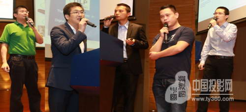 从左到右:广景CEO杨伟梁/TI DLP负责人郑海兵/OSRAM LED Antony/坚果董事长胡振宇/联想集团DLP负责人冯成