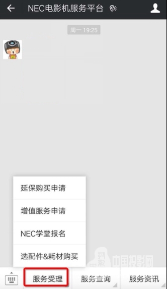 1. 进入“NEC电影机服务平台”,点击“服务受理”,选择“选配件&耗材购买”