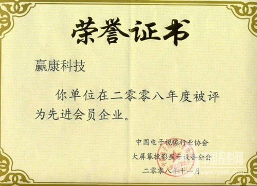 近日,赢康获得由中国电子视像行业协会大屏幕投影显示设备分会颁发的会员证。
