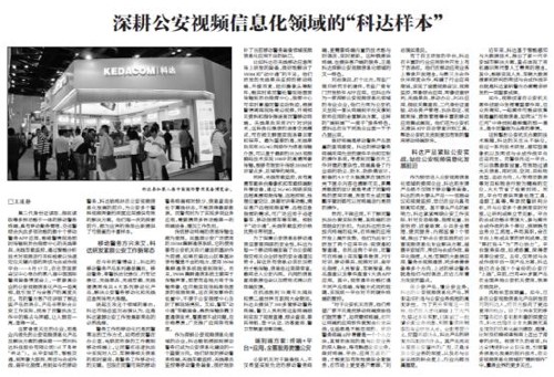2016年5月19日,《人民公安报》首版刊文报道国务委员、公安部部长郭声琨18日参观在京举办的第八届中国国际警用装备博览会,同期二版用半版4000字长文《深耕公安视频信息化领域的“科达样本”》深度报道科达,全面呈现科达在公安视频信息领域的技术积累和应用成果。以下为全文转载内容。