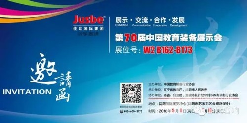 第70届中国教育装备展示会定于2016年5月8日至5月10日在辽宁沈阳国际展览中心隆重举行,届时恭请光临Jusbe(佳比)展位:W2馆,展位号B162 。