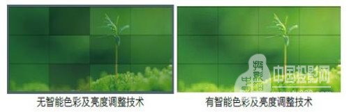 巨洋独创的智能亮度和色彩调整技术,通过读取内置的亮度、色彩感知器的输出信号,对投影单元之间进行自动的色彩/亮度校正,保证了整个拼接显示墙的色彩/亮度一致,极大的缩短了调整时间,减少了调整难度。该技术通过比较每个单元的白(White)、红(Red)、蓝(blue)、黄(yellow)、青(cyan)以及品红(magenta)等颜色的色彩/亮度值,自动计算出每个显示单元的调节值,实现整个拼接墙体色彩、亮度的一致性。