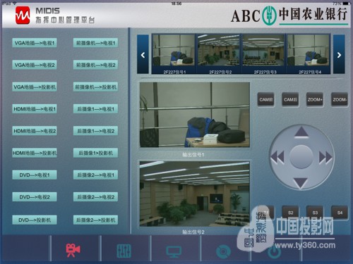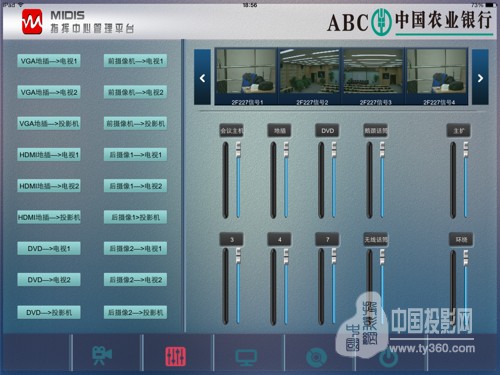 30余间厅室其中11间,采用MIDIS多媒体信息分布交互系统做整体的互联互通,核心设备主要包含:系统主服务平台、多媒体录播服务平台、输入/输出接口机、音频接口机以及环境控制接口机等周边配套设备,前端信号源多为高清摄像头信号以及本地PC的信号,核心显示方式为投影显示,其中多功能厅采用8500流明的高清工程投影机,这11间会议室之间的音频、视频、控制信号均可以在任意一个网络覆盖的位置,通过iPad控制屏,实现交互和管控,达到传统跟数字化的完美结合。