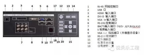 VGA电脑输入 1 (15针)× 1、BNC*5 (RGBHV)× 1、Video BNC× 1、S-端子 (Mini DIN 4 pin)× 1、DVI-I× 1、HDMI (v1.3带音频)× 2、S-Video(阴) × 1 |