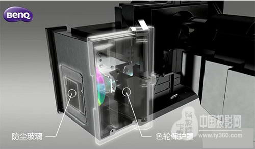 同时,针对投影机的色轮传感器部分,明基LX810STD激光投影机专门设计色轮防尘玻璃,将色轮迎风面积尽可能包裹起来,阻断可能给传感器带来灰尘堆积的风路循环,大幅度提升投影机在高粉尘环境下生存能力。