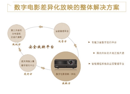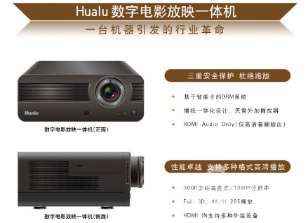 作为一台具备独家专利技术的电影播放设备,它独有播投一体化设计,无需外加播放器,基于智能卡的DRM版权保护系统,HDMI audio only(仅高清音频输出)——三重安全保护,有效保障了影视内容传输和安全放映问题,真正杜绝跑版,为高清正版影视内容高效的投递、运营与管理扫清了障碍。