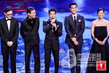 《寒战2》剧组亮相上海国际电影节开幕式。左起:导演梁乐民、梁家辉、郭富城、彭于晏、杨采妮