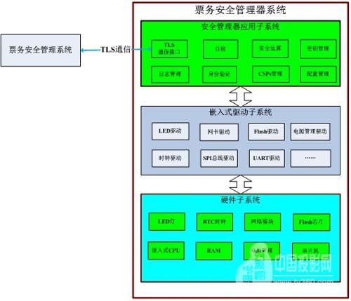 票务安全管理器模块涉及到硬件系统和软件系统两个方面,硬件系统部分的主体设计为一块PCB板卡,板卡中采用嵌入式CPU芯片运行嵌入式操作系统环境;软件部分包括嵌入式环境的基本结构和安全系统应用软件,并运行在嵌入式操作系统环境中。票务安全管理器对外提供相应的SDK开发包,对票务安全管理系统进行系统集成开发,为票务安全管理系统提供信息安全相关功能服务。