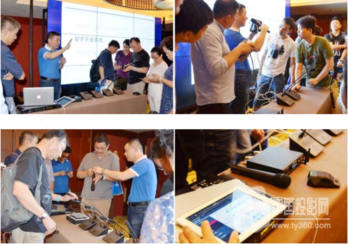 从 2.4GHz 技术频段讲起,谈及全双工模式传输、抗干扰能力强、确保信号稳定的频率、时间、空间三集式保障等特点。特别对 ATW-T1006 界面式话筒和ATW-T1007 两新款发射器的内置双天线,一体冲压铸铁机身和完全可满足中小型会议一天 9 小时的会议用电量等优势作了详细的说明和案例演示。