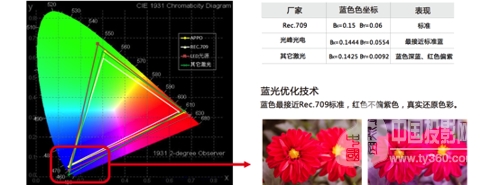红光占比达到10%,更饱和的色彩表现。大部分激光拼墙红光占比只有7%不到,红色画面表现暗淡。基于ALPD技术,光峰激光拼墙的红光占比达到10%,达到TI推荐的颜色表现标准,因此图像表现更真实。