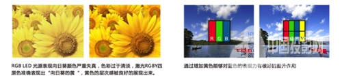 ALPD激光投影机采用 RGBY(红绿蓝黄) 四段色轮,比传统采用 RGBW (红绿蓝白)四段色轮的投影机,多出一段可以用于颜色显示的Y段。