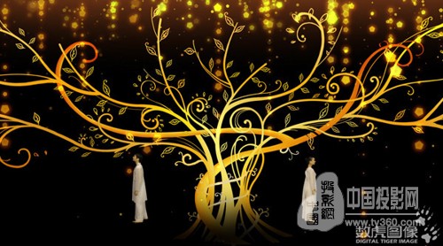 舞蹈《藤缠树》,LED视频与全息投影配合,通过粒子特效塑造生命之树