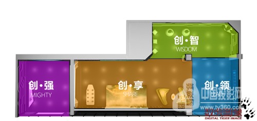 进厅处的“创•强”展陈区,利用3块无缝横拼的LCD屏播放数虎图像为其制作的威新软件科技园区第一形象宣传片,让参观者在观看和了解园区总体介绍的同时,也近距离体验科技园展厅干练快捷的设计节奏和现代时尚的理念特性。