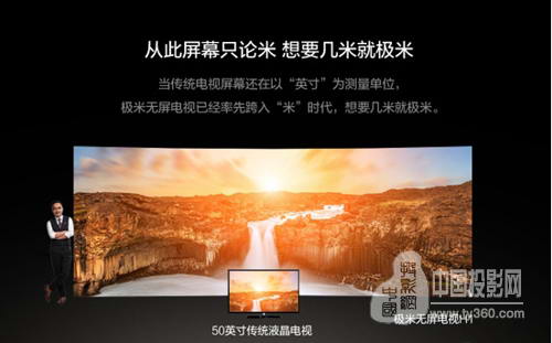 极米H1最大可投射出超6米宽的屏幕,尺寸相当于36台50村电视拼在一起,用“米”来定义电视屏幕尺寸,对于无屏电视来说,这一定义方式更为直观,易于理解,拉近了产品与用户的距离。值得一提的是,H1无屏电视将亮度提升至900流明,播放效果可支持白天观看。