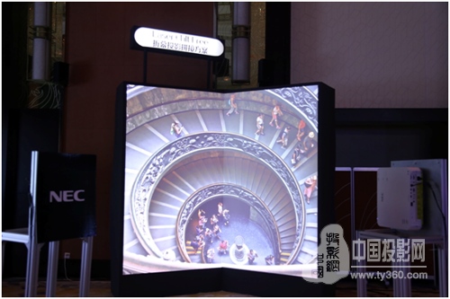 为应对商场橱窗、酒店娱乐等行业需求。NEC还在现场展示了折幕投影拼接解决方案,该方案采用NECP502HL+工程投影机,具有全高清分辨率,20000小时超长寿命,大范围镜头位移(位移达到了62%),支持左右镜头位移(位移达到28%),并且支持360度投影和竖向投影,功能极为齐备。