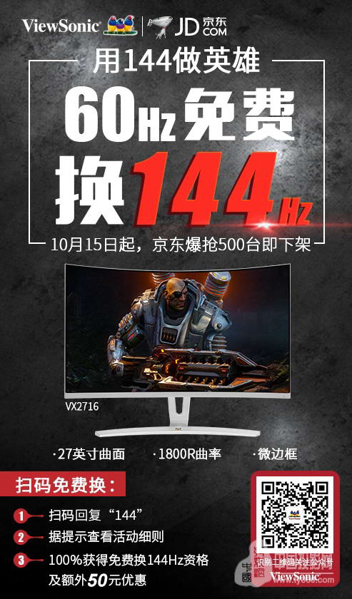 技术薄发,视觉盛宴,炫酷品质,优派VX2716-SCMH正强势登陆寻常人家朋友圈!钜惠惊喜三步到位,专享密令轻松GET!将如下图片转发至朋友圈并截图,扫码关注优派公众号同时回复截图就能立即得到50元减免优惠与60Hz更换144Hz刷新率的资格。144Hz英雄近在咫尺,赶快与小伙伴们加入进来,带你极速畅游电竞的无限新视界!
