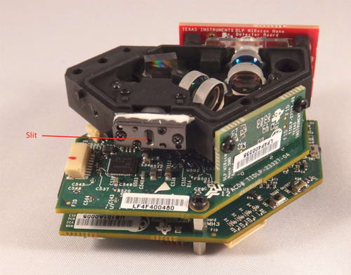 从样本上反射回的光被采集镜头所搜集,并且通过输入狭缝聚焦在光引擎上。所选择的狭缝尺寸能够平衡波长分辨率和分光计的信噪比(SNR)。这个分光计使用一个长宽分别为1.69毫米 x 25微米的狭缝。通过狭缝的光在第一组镜头上校准,通过一个885纳米长的波通滤波器,然后打在一个反射光栅上。这个与聚焦透镜组合在一起的光栅将光源色散为构成它的连续波长(多色光线)。聚焦透镜将狭缝图像展开在DLP2010NIRDMD上。这个狭缝图像的不同波长水平分布在DLP2010NIRDMD上。光学系统将900纳米的波长成像在DMD的一端上,将1700纳米的波长成像在另一端上,而在中间按顺序散开所有其它波长。