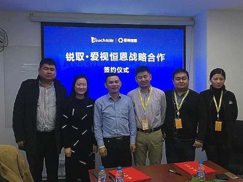 深圳锐取信息技术股份有限公司首席执行官CEO、董事长张秋先生(左三) 爱视恒恩总经理潘禾为先生(左四)