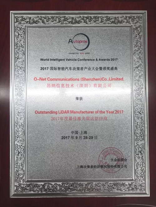 昂纳集团一直以来都非常重视新兴产业的发展,在智能网联汽车发展提速、国家支持力度不断提升的形势下,坚持战略上的前瞻部署和技术上的步步为营,始终保持对新兴科技的热度,抓住一切机遇。在2017年9月公开的新一代光雷达产品“PANDA”的发布会上,昂纳集团董事会主席兼行政总裁那庆林先生也曾说道:“昂纳势将成为高速增长的先进辅助驾驶系统(ADAS)市场的主要LiDAR技术供应商。”此次在2017国际智能汽车决策者产业大会斩获的奖项,足以证明昂纳在智能汽车行业收获的认可,我们立志在智能汽车制造行业发展道路上获得更多的认可和成就!