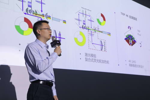 在本次巡展活动中,我们还有幸采访到明基中国投影机事业部产品经理张志军先生。据张志军介绍,投影亮度是激光投影机重要指标。明基初期使用独立激光单体配合单荧光轮设计,透过成熟的纯蓝激光,激发荧光轮产生绿色与红色光,最后加上激光自身的蓝光,完整提供RGB三原色。为提升亮度、促进光学系统小型化,明基后来采用全新模块化架构激光发光模组,取代独立激光单体,提升激光能量密度,也让荧光转换后的光线更多集中到DMD芯片上;最新设计则是用更高密度激光模块,搭配复合式荧光轮加色轮的双色轮系统。
