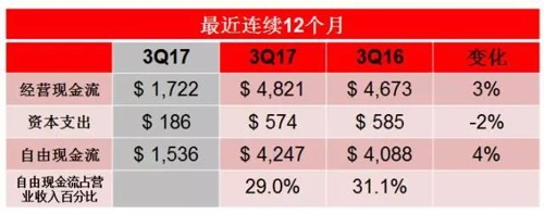 “在过去12个月中,我们通过经营活动所产生的现金流达到48亿美元,再次体现了公司商业模式的优势。自由现金流在过去12个月中达到42亿美元,占营业收入的29.0%。