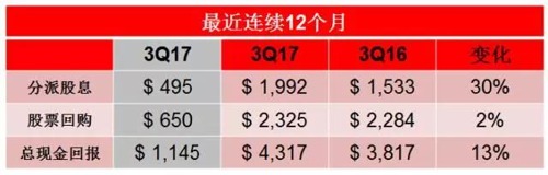 “在过去12个月中,通过股票回购和分派股息,我们给股东们的回报达到43亿美元。今年9月,TI宣布将其股息提升24%,同时增加了60亿美金的股票回购授权,这一切都体现了我们将所有自由现金流回报给股东的承诺。