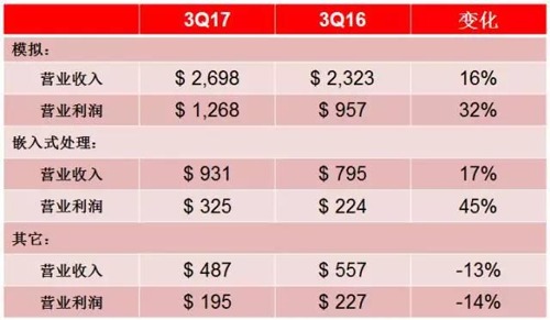 “在我们的核心业务中,较去年同期相比,模拟产品的营业收入增长16%,嵌入式处理产品的营业收入同比增长17 %。两项业务的营业毛利均有所提高。