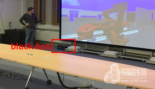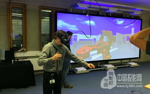 VR-wall主要有大屏显示系统、VR眼镜、视频融合模组三大部分组成。其中显示屏幕大小为5.30 x 2.25 m,目前施耐德数字使用的是SEEMILE的激光超短焦作为显示终端设备,在屏幕的上下位置分别架设三台,通过他们自己开发的叫做“blake-box”的融合器,五分钟左右就能完成画面矫正和六通道融合。