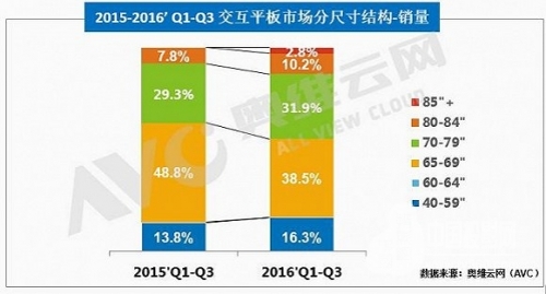 整体Q1-Q3IWB市场大尺寸增长明显,80寸以上市场整体需求不断增加,历年来,大尺寸份额的不断增加是有目共睹的,从下图我们也可以发现,中小尺寸中,65寸同比份额有很大的下降,70寸有小幅上涨。而从宏观环境来看,未来两年,各省全面改薄将会逐步完成,尤其是最后一年,偏远地区从改薄难度和资金考虑,中小尺寸会成为需求热点,而现如今,整体交互平板市场价格在不断下降,70寸对65寸已经形成替代趋势,所以奥维云网预测,未来两到三年内,70寸将成为主流需求,在整体市场中占据30%以上的份额。