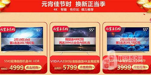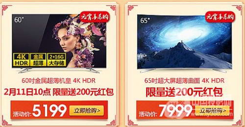 在元宵节想买电视机的用户朋友不妨打开海信电视官方旗舰店,你会发现,不仅有互动猜灯谜抽55英寸4K电视活动,在2月11日——2月12日,每日9点30分准时开抢,1分秒50元红包;2月11日10点,55寸金属超薄机皇4K HDR电视LED55EC720US抢购价4199元,第一名送2017元红包;60英寸金属超薄机皇4K HDR电视LED60EC720US抢购价5199元,10点开抢限量送200元红包,65英寸超大屏超薄曲面4K HDR电视LED65EC780UC抢购价7999元,并限量送200元红包。
