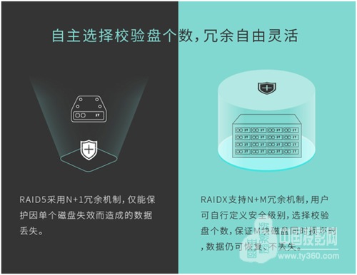 RAID5只支持N+1冗余机制,在一个磁盘组里,同时只能有一块盘损坏,否则数据就会丢失。而RAIDX支持更灵活的N+M冗余机制,可以根据对可靠性要求的高低,灵活选择M块盘的冗余方案。