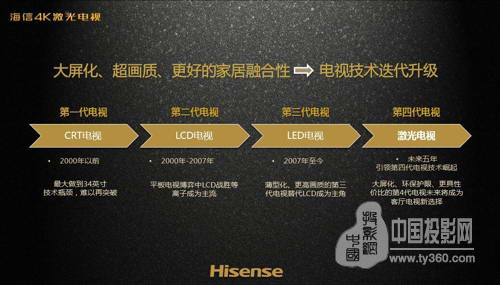 我们先来了解一下电视技术的发展历程。2000年以前主要以CRT电视为主,电视机尺寸最大只能做到34寸便难以突破;随后7年,平板电视LCD逐渐成为主流,但电视的画质和厚度依然是技术瓶颈;目前,我们对电视的要求不仅停留在画质和厚度,更是尺寸上的追求,所以LED电视成为替代LCD的主角;未来五年,激光电视引领第四代电视技术崛起,大屏化、环保护眼、更具性价比的第四代电视将成为客厅新选择。