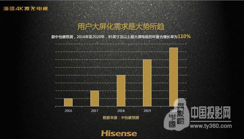 根据中怡康的预测,75英寸以上电视2016年的销量为6.6万台、2017年为23.3万台、2018年为65.3万台,未来超大屏市场即将迅速爆量,显然这个增长量不能使用液晶电视产品来满足,因为其价格的下降速度无法跟得上需求。并且液晶电视尺寸大了,安装和搬运问题,电量损耗问题都不好解决,因此激光电视产品出现了。