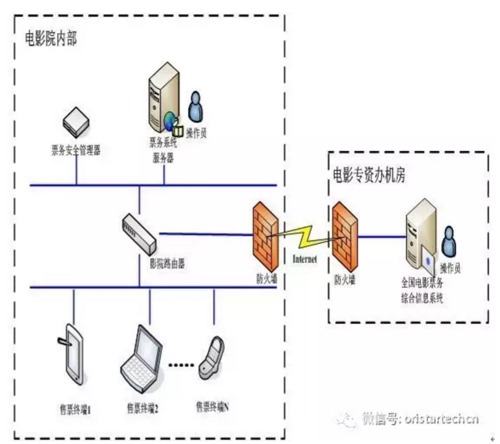 票务安全管理器部署在影院的局域网内部,可以运行在影院的中心机房,通过路由器与影院的票务服务器系统进行物理连接,影院的票务服务器系统通过局域网与票务安全管理器进行TLS安全通信连接,通信双方进行严格双向身份认证,并采用专用会话协议进行消息的发送和接收。