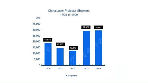 如在2016年第3季度,激光投影机整体市场销量首次突破5万台,其中教育市场销量实现4万台。而鸿合科技仅在教育市场中就一举拿下2.5万台;2016年第4季度,激光投影机销量为29602台,其中鸿合出货16794台,占比高达56.7%。可以说:近两年来激光投影市场最大赢家当属鸿合。