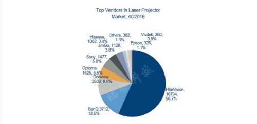 2016Q4鸿合HiteVision激光投影机销量、份额均居国内同类行业首位(来源:IDC)