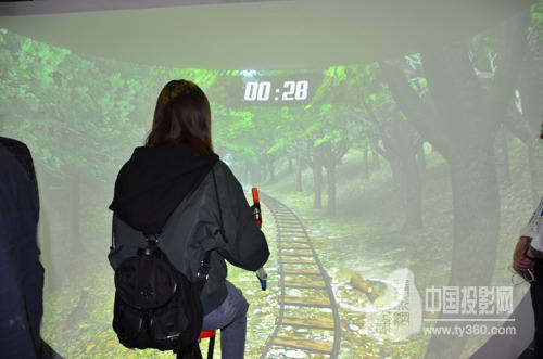 紧接着是动感单车体验——主题公园解决方案,该方案运用3台12,000流明的PT-SRZ12KC三芯片DLP激光投影机并配置一台模拟单车,当人在模拟单车上骑行时,画面也随之移动,实现了“舟行碧波上,人在画中游”的身临其境之感,打造了专属的沉浸式娱乐互动行业应用解决方案,此类展示方案在主题公园中应用将大大提高娱乐性。