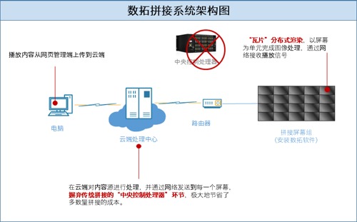 什么才是真正的互联网云技术拼接?数拓科技自主研发了“瓦片”分布式渲染技术,与传统的中央处理器拼接技术完全不同,在云端处理中心完成信号源的切割与发送,以单位屏幕为控制单元,拼接数量无上限,使屏幕能够如同瓦片一般拼接组合,实现超长、超大、无限拼。