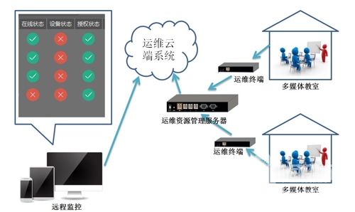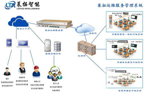 鉴于上面的原因,响应国家对“互联网+”应用的提倡,广州莱拓智能科技有限公司经过两年时间的潜心钻研,研发了云运维多媒体设备管理系统(简称:云运维管理系统),减轻了老师和学校的压力,增强了学校智能化管理,促进教学的发展。