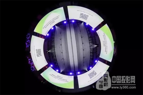 创新大会晚宴现场的这一双面弧幕投影,就成为了当日的焦点之一。6片弧形长方形屏幕组成一个圆形“阵列”,屏幕内外双面均可看到投影内容。该圆形“阵列”悬挂在圆形舞台上方,大小、方位都非常适宜,既夺目别致,又不会挡住舞台,是非常适合酒店宴会演出的设计。